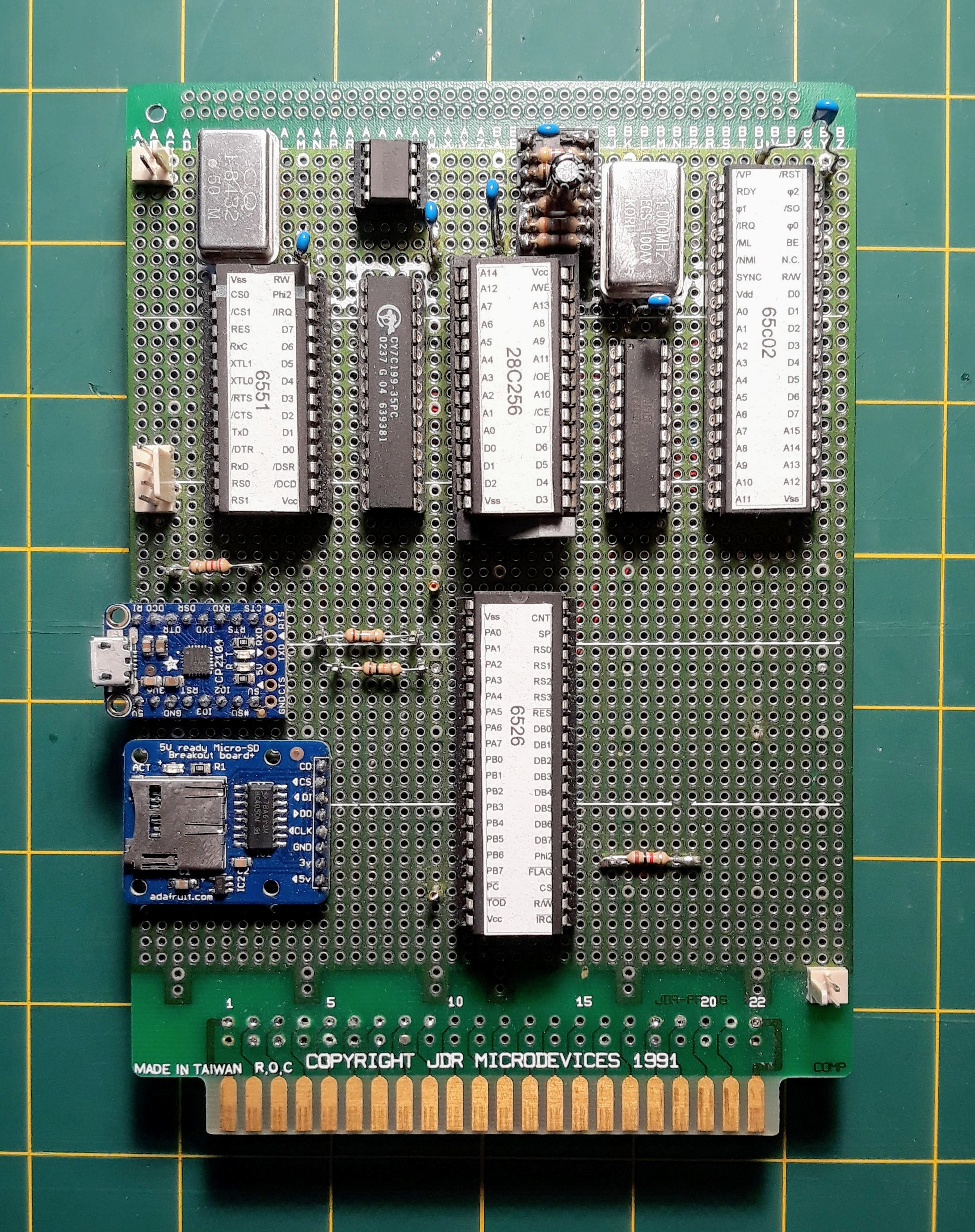 The Retro-65 does not have its own video, sound, or keyboard. I'd really like to add those at some point, but it may be a while before I get there... so all the UI is handled through the serial port. Two things that might be a little unique are two breakout boards from Adafruit: a TTL serial to USB converter based on the CP1204, and a micro-SD breakout board with a voltage level shift chip built in. I'm currently working on core routines to try to access an SD card for storage, bit banging through the CIA.