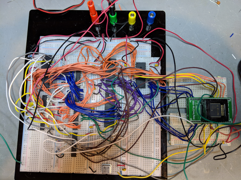 I'm attaching a snap of the project and the pdf of the schematic. Someone is going to scream at me now when they see that prototype construction... :) (I swear I started out with a beautiful planned layout to keep wires short!) And the PLCC44 to DIP44 adapter is too wide to fit on a single breadboard which is why it's way off to the side in such a hacky fashion. But aside from the serial clock being wrong it is initializing the UART correctly, and the board is running reliably at 1 MHz; I have code that is manually twiddling a VIA output pin to verify.