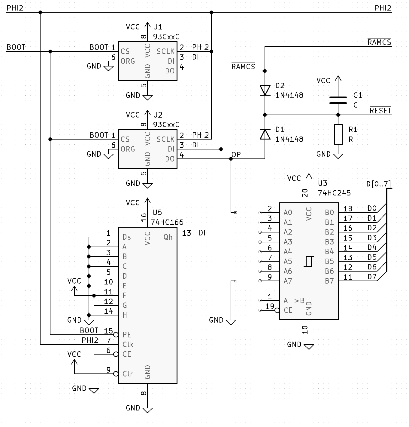 I changed the reset wiring a bit to make it tolerant of brief dips as new data is clocked from the EEPROMs, in case both signals need to change at the same time. The RC circuit should be very fast [...] my only addition would be the capacitor.