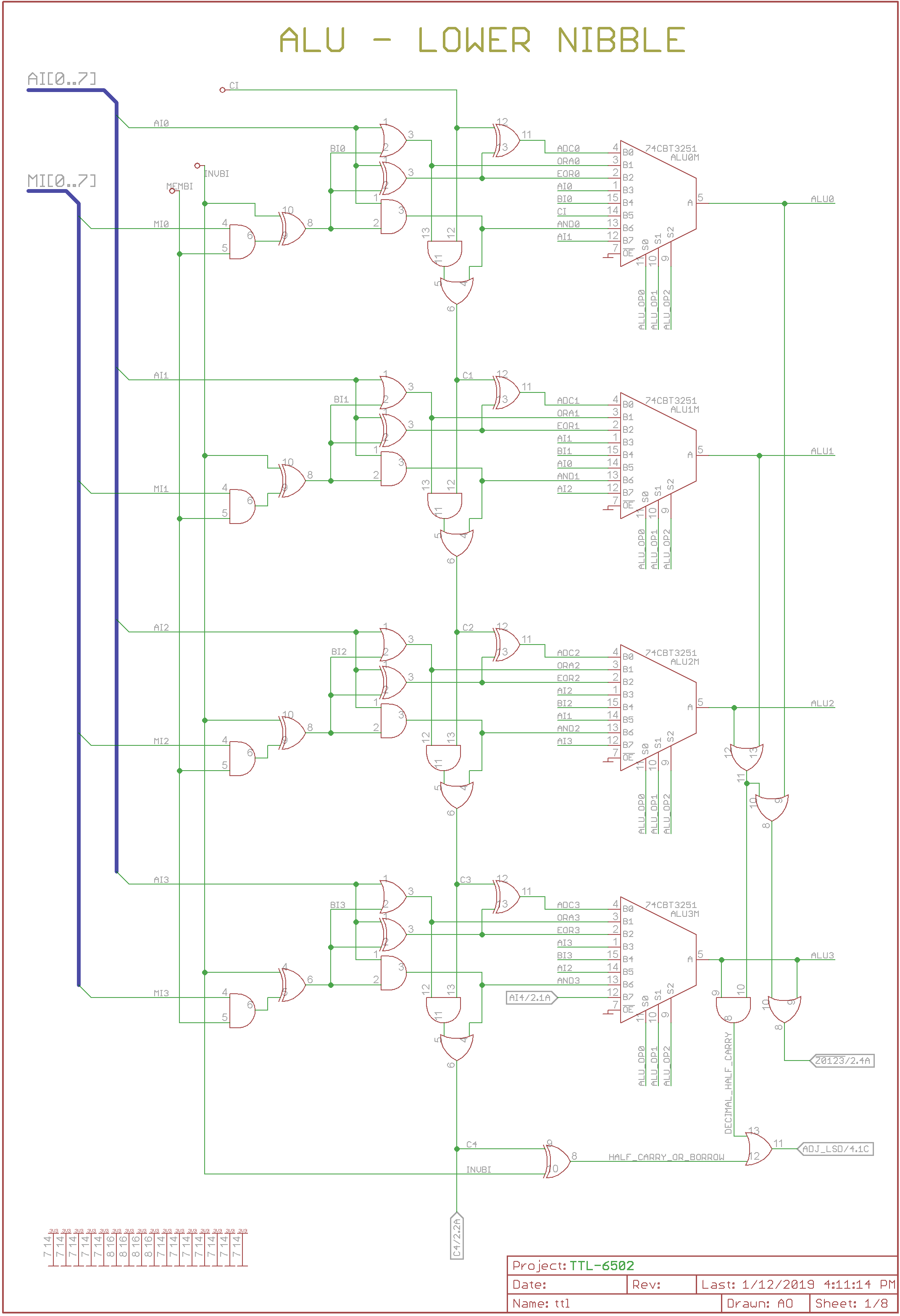 Added buses to ALU sheet. I also copied that sheet for higher nibble, and copied ADL to ADH.