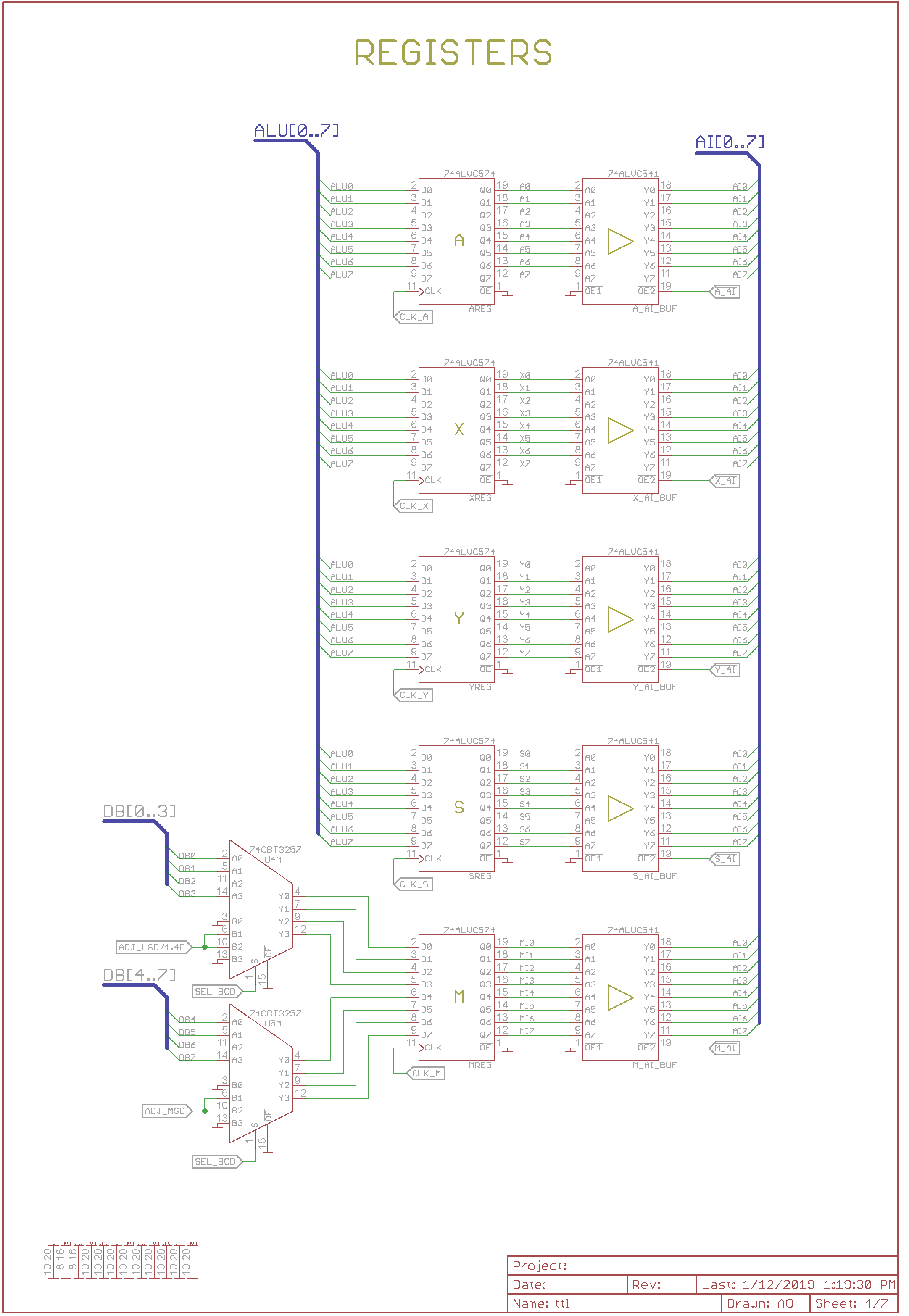 Almost complete schematic for bits 0..7 of the address bus and everything driving it. Only thing missing are the LEDs and the OE/CLK control signals.