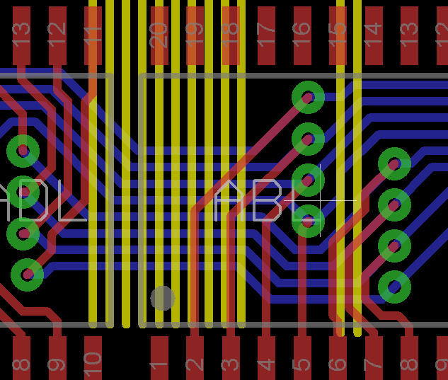 Experimenting with bus crossings... the problem is that everything is connected to everything else, so no matter how you place the components, it's going to be a mess. And of course, these TSSOP packages are nice and compact, but there's no room to route a trace between the pins, and it starts to get crowded with vias.