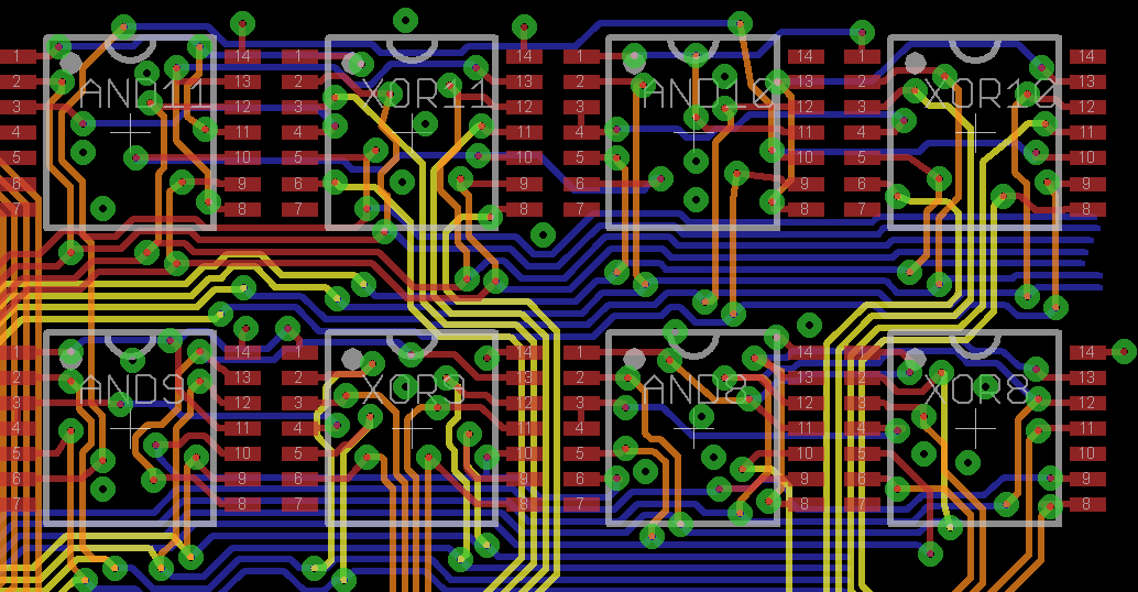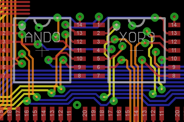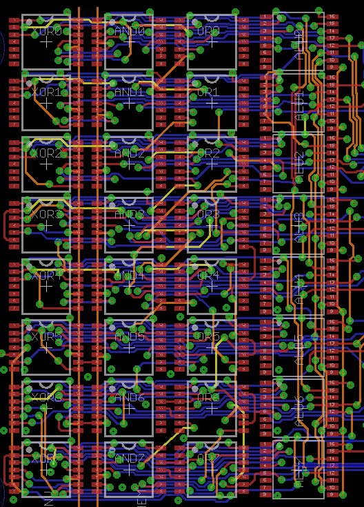 Incrementer stage (bits 4-7) redone properly with good pour flow on all layers. Had to swap bunch of gates so that the output of the incrementer was in proper order for connecting to ADL bus (vertical orange traces on the right)