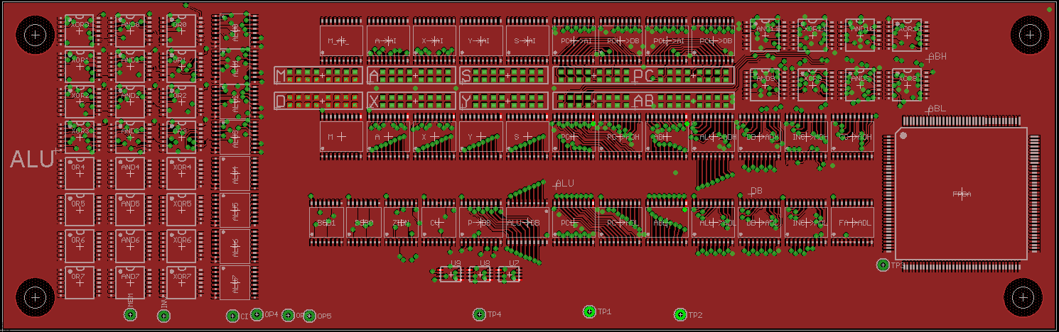 Picture of full board so far. Hooked up register inputs to ALU bus, most of the status flag logic, as well as DB to M register. Down from 400 to 300 wires.