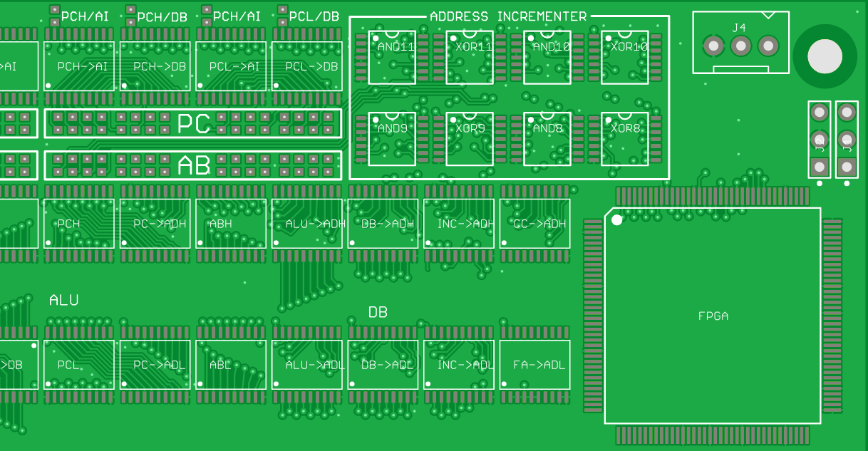 I've marked a few buses going in/out of this area. The AB/DB buses go out to the FPGA, and the ALU bus goes to output of ALU (to the left). The DB/ALU buses also need to go to lower part of address bus.