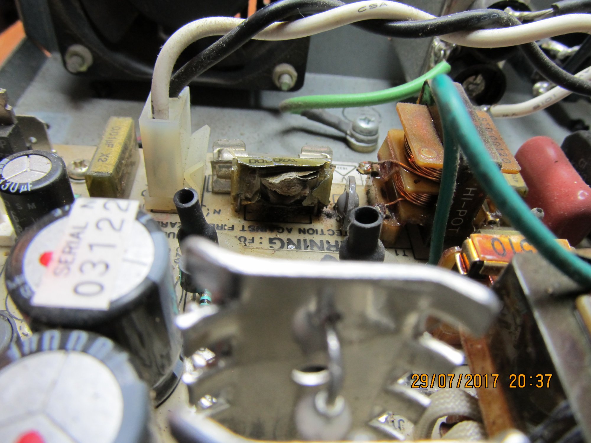 I immediately powered it off (even though the CRT was still showing a picture). I looked all around and couldn't find anything substantial that was fried. Other than a potted inductor.