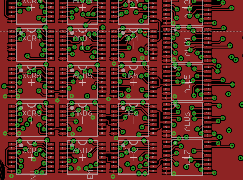 I did manage to finish the ALU section, including control lines. Optimized the traces, and added extra GND vias. Also added a bypass cap near each IC (on the bottom, next to the VDD via). Fixed all design rule errors, and put everything on grid in 45 degree angles (using 0.075 mm grid, about 3 mil)