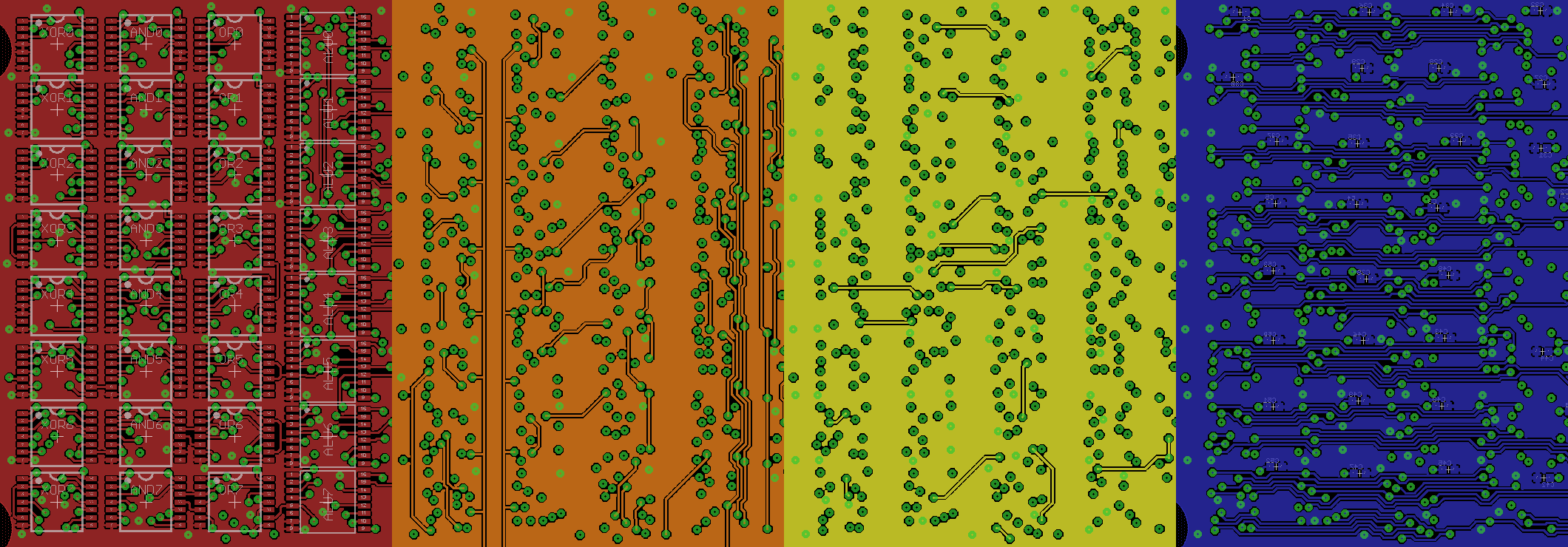 Didn't have much time today, but I added a couple of control signals for the register clocks. Because these are sensitive to cross talk (unlike everything else) I put them in the GND layer, separated by thin GND strips. There are 4 more clock signals in the design, and the rest is all data/enable which isn't critical.