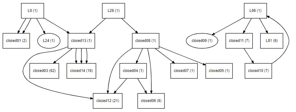 The attached graph shows the flow between the stretches of the code, identified by the label of the first instruction of the stretch. The numbers show the count how often the stretch was entered (from the sample execution path). => The helper subroutines are clearly discernible, even with this very crude analysis.