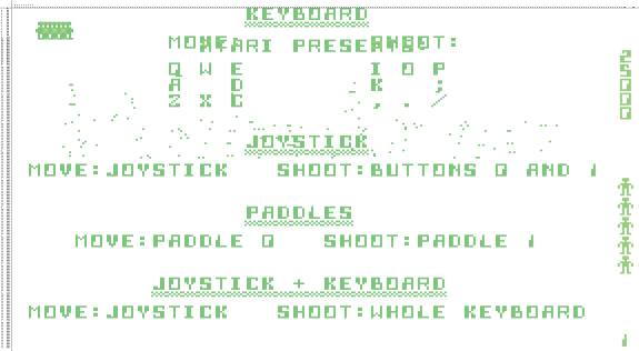 The Apple II is severly constrained in terms of memory. Consequently, Robotron uses for the "cut scenes" the actual game code to display elements like the player character or enemies. From a reverse engineering point of view this is fortunate, because I can use the uncluttered (and even scripted) movements of elements on the start screens to understand how the game moves "sprites" around the screen. For an example see the movements of the player character on the screen explaining the controls.