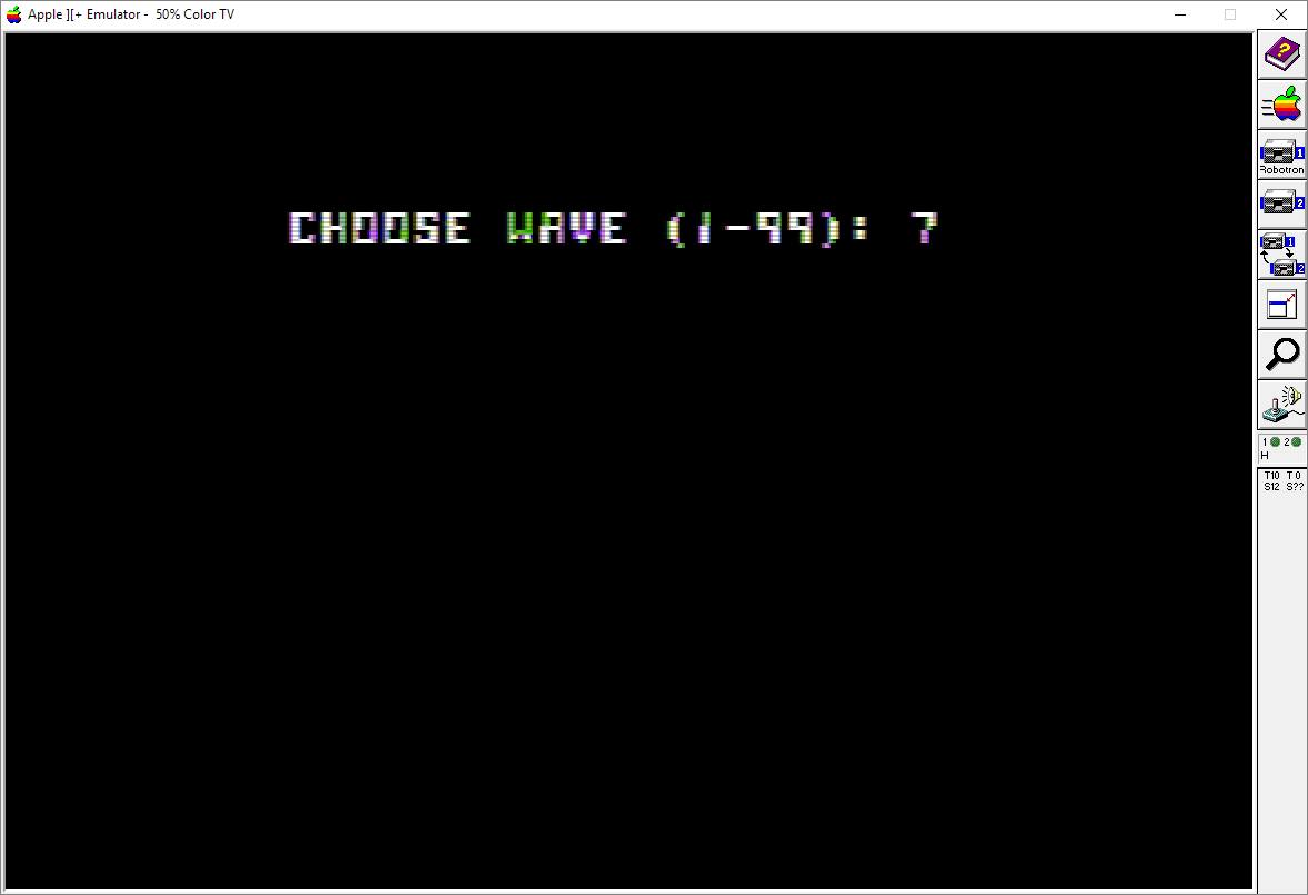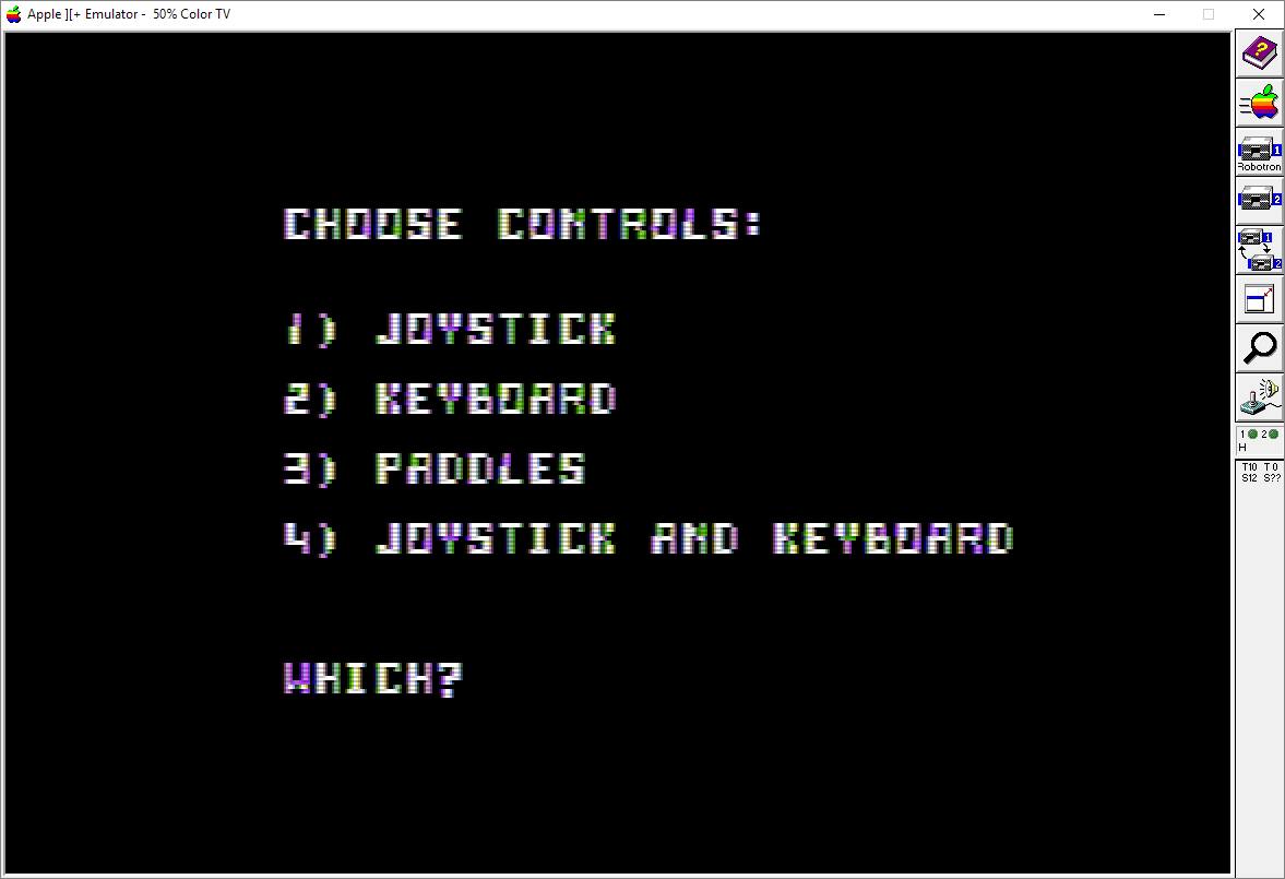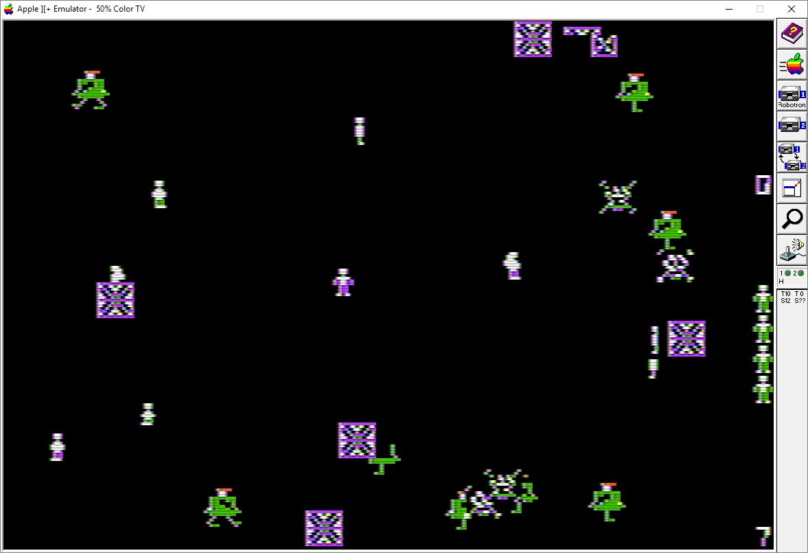 The Apple II is severly constrained in terms of memory. Consequently, Robotron uses for the "cut scenes" the actual game code to display elements like the player character or enemies. From a reverse engineering point of view this is fortunate, because I can use the uncluttered (and even scripted) movements of elements on the start screens to understand how the game moves "sprites" around the screen. For an example see the movements of the player character on the screen explaining the controls.
