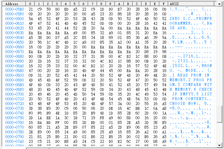 I've just found some old parts from my original Commodore 64 days, and among them was a cartridge board with a 2716 EPROM fitted. It was the firmware for a C64-based EPROM programmer (bare PCB) and, out of curiosity, I dumped the contents.