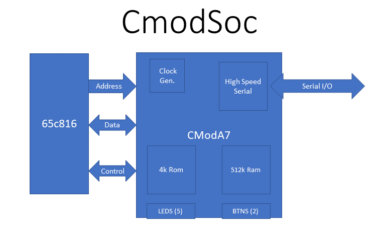 I've got this project going on in the background with my other work to interface a CmodA7 to a 65C816. It doesn't quite work yet. On reset the blue LED lights up indicating the cpu is accessing the ROM, but it doesn't light up another led like it's supposed to or send a power on message. The cmod contains a high-speed uart (921600 baud), ram, rom.