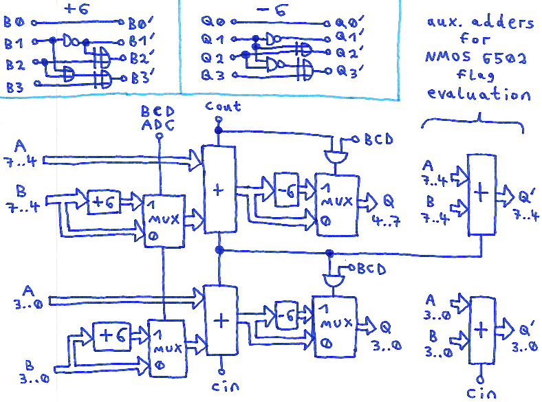 To be honest, I'm not exactly sure how NMOS 6502 compatible my schematic above is when it comes to non_BCD values in decimal mode.