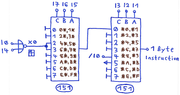 //One of the eight 74151 inputs then rakes through two colums of the OpCode table.