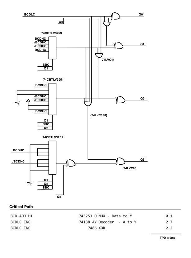 Here’s where I’m at for the BCD.ADJ.HI adder, which now includes a BCDLC carry input. It’s just the same as the previous BCD.ADJ.LO circuit, but followed by a carry-lookahead incrementer (the carry-look ahead uses a 74LVC138 as a 4-input AND). The XOR gates that followed the MUXes for Q1 and Q2 have been folded into the Multiplexers to make the incrementer more efficient. The combined circuit comes in at 5ns, as follows: