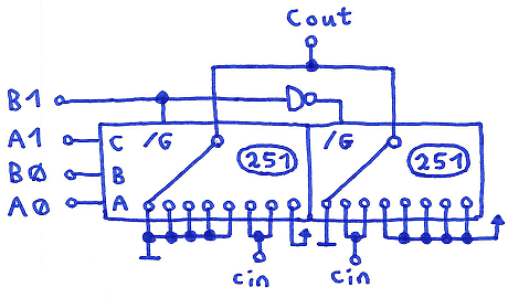 Two 8:1 FET multiplexers (74251 or 74CBTLV3251) working as a 2 Bit carry lookahead circuitry for an adder,