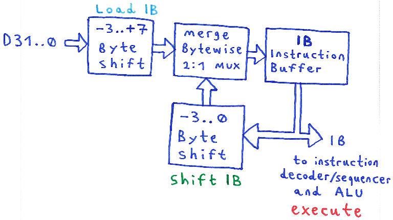I just had a quick thought about the instruction buffer that could be a simpler way to build it, what if we had a 8 byte circular buffer that we could load into either the low word or the high word, and coupled with that we have an instruction pointer into the buffer. This would seem to be easier to implement.