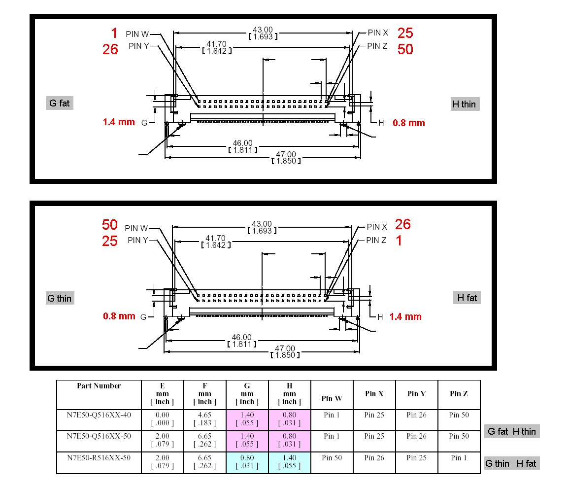 We can summarize by saying, "The end with the fat ridge has pins 1 and 26. The end with the thin ridge has pins 25 and 50." And bear in mind that each orientation is a 180 degree rotation of the other -- NOT a mirror image.