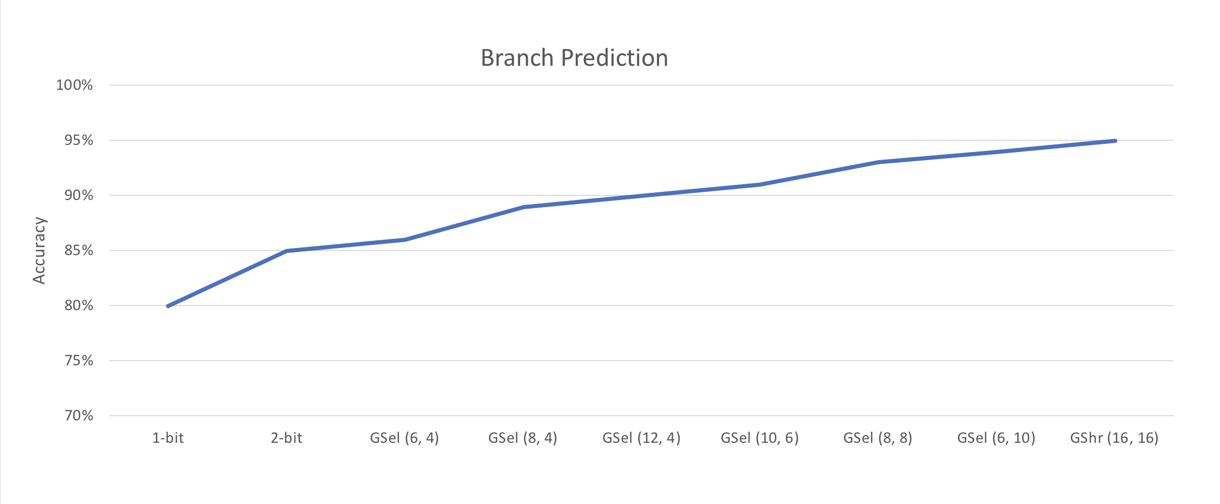 Meanwhile, our results plumet below 1k, reaching just 70% at 64 bytes. By way of comparison, below is a graph showing gshare accuracy as a function of PHT size from our tests: