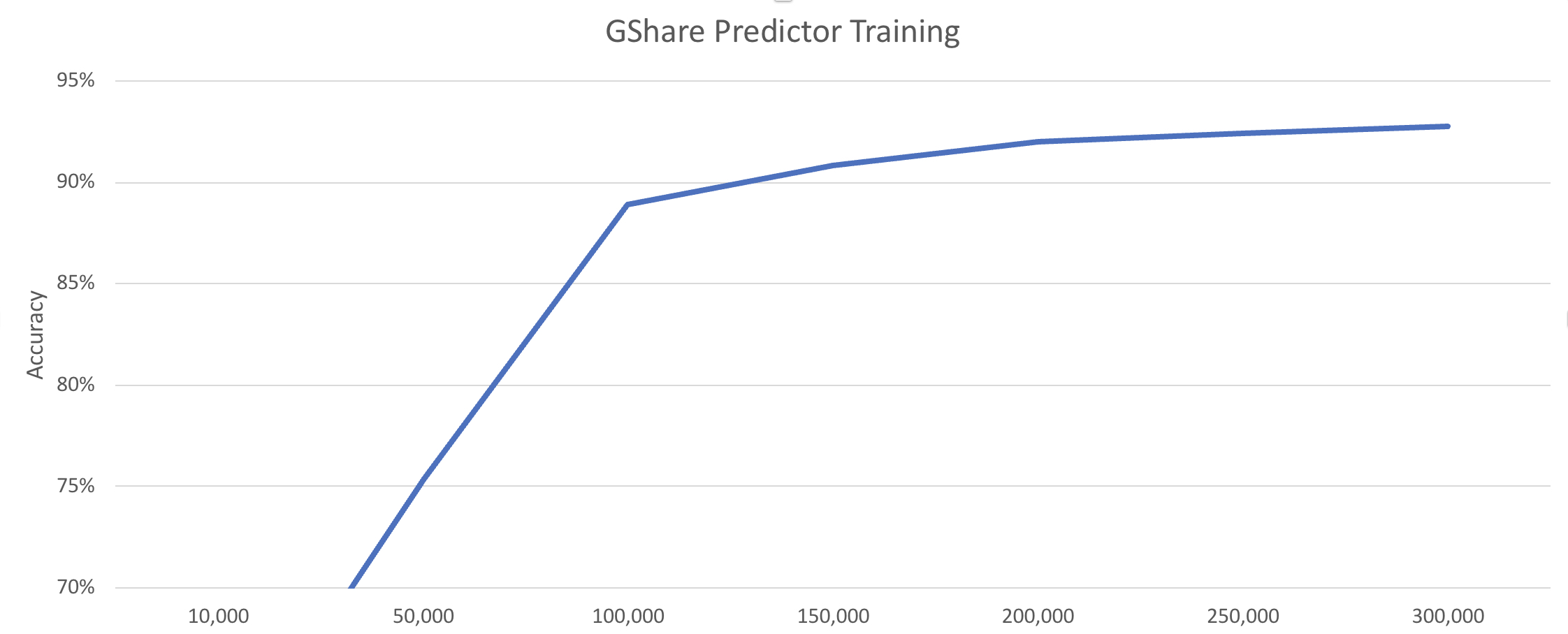 The GShare predictor takes about 100,000 cycles to exceed the bi-modal predictor’s 85% threshold. Perhaps simply easing the GHR from 0 to 16 bits at the rate of 1 bit every few thousand cycles might do the trick.