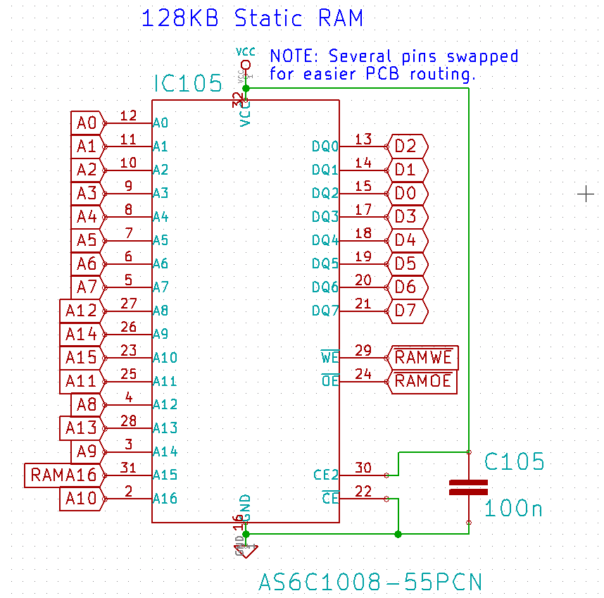 Also, keep in mind that it's okay to swap address bus pins or data bus pins on the SRAM chip, to make routing easier! See attached.