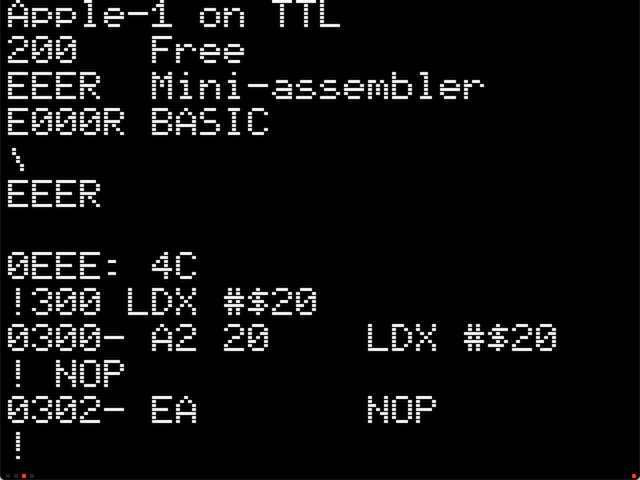 I also added software-based PIA chip emulation. The Gigatron kernel now has a vertical blank interrupt that can be used to emulate the PIA chip. The interrupt capability was added with this "application" in mind :-). PIA emulation isn't 100.00% accurate, but good enough to fool most A1 programs. You can read and write to KBD/KBDCR/DSP and (almost) get what you would expect.