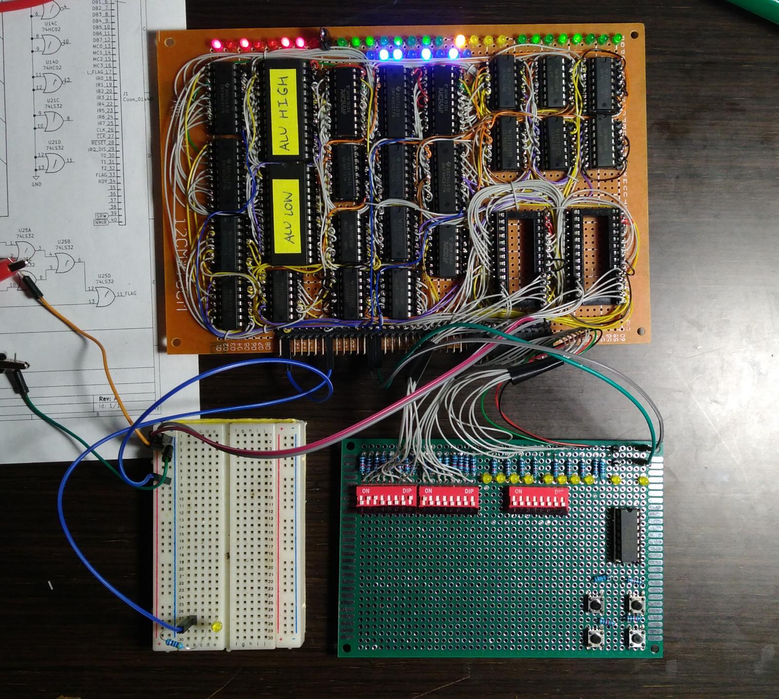 The ALU card is also done. This is the most complicated one, quite a lot of wiring in a pretty tight space. I ended up using a colour code for the flags instead of the data bus, as their routing was more complex. Luckily enough, I made no mistakes on the wiring (I buzzed out every single connection) and after some preliminary testing seems to be doing the business.