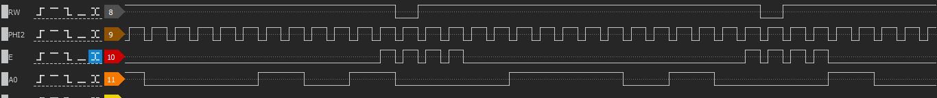 Attached is a screenshot from a logic analyzer just to clarify. A0 is a register select for the LCD. Four pulses can be seen on the enable line (output from the address decoder anded with PHI2) Writes are performed on the second falling edge.