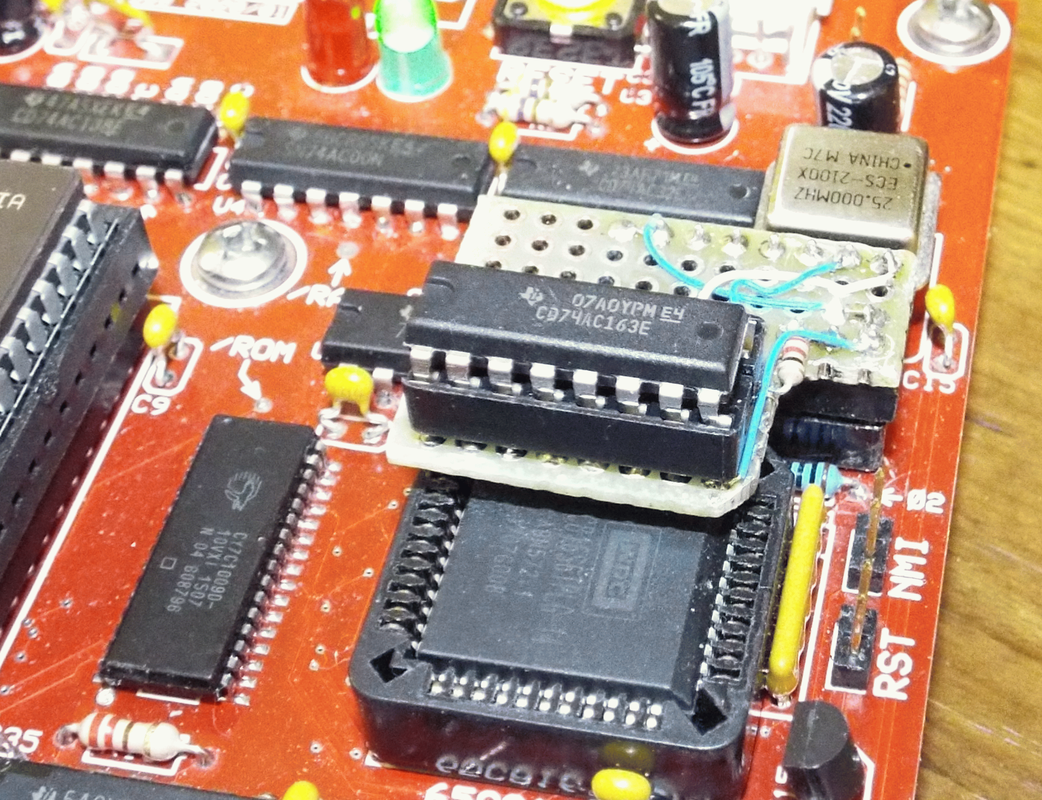 The design looked sound on paper, so I was ready to give it a try. The plan was to build this gadget on a small PCB, arranged so it could be plugged into the existing Ø2 flip-flop's socket. Some bodge wires