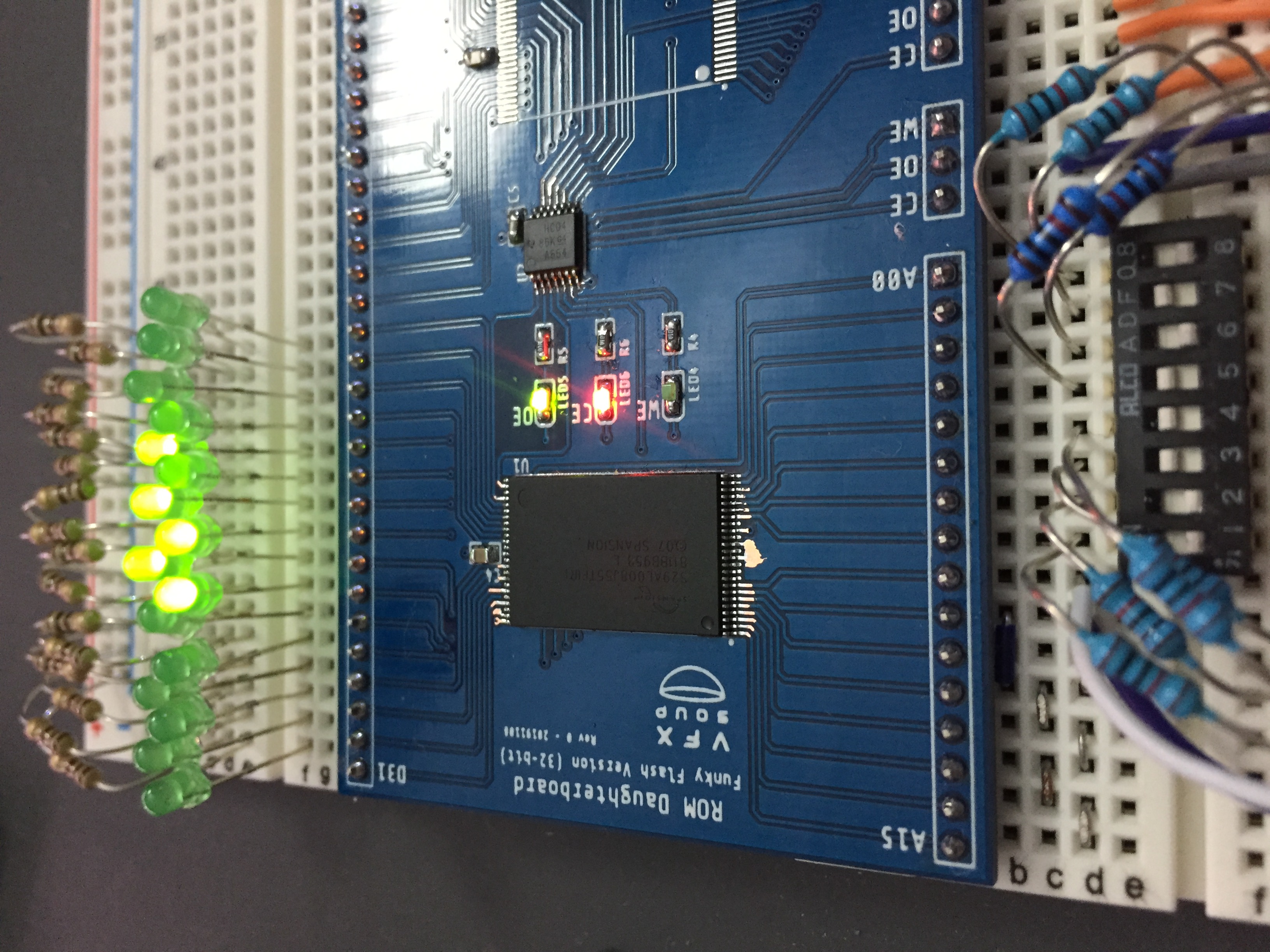 As you can see it is missing any kind of logic level shifting, and so is mostly useless (the little chip in the middle is just a 74HC04 hex inverter for the enable LEDs, which I've dropped from the new version because the enables are all hard wired preset). I decided to write one half of my microcode to one of my flash chips anyway, just to see if it would actually work, and hand-soldered the TSOP48 chip to the board. As you can see it was quite traumatic for the poor PCB; even though the pins were drowning in flux it was 30 minutes of hair-raising drag soldering, solder wicking, and swearing, where I was convinced I'd fried the chip. However after hooking it up to a couple of breadboards, and remembering to enable the chip-enable line, it miraculously worked just fine. This was doubly successful because it also showed my export routine from the software emulation was also writing everything out properly.