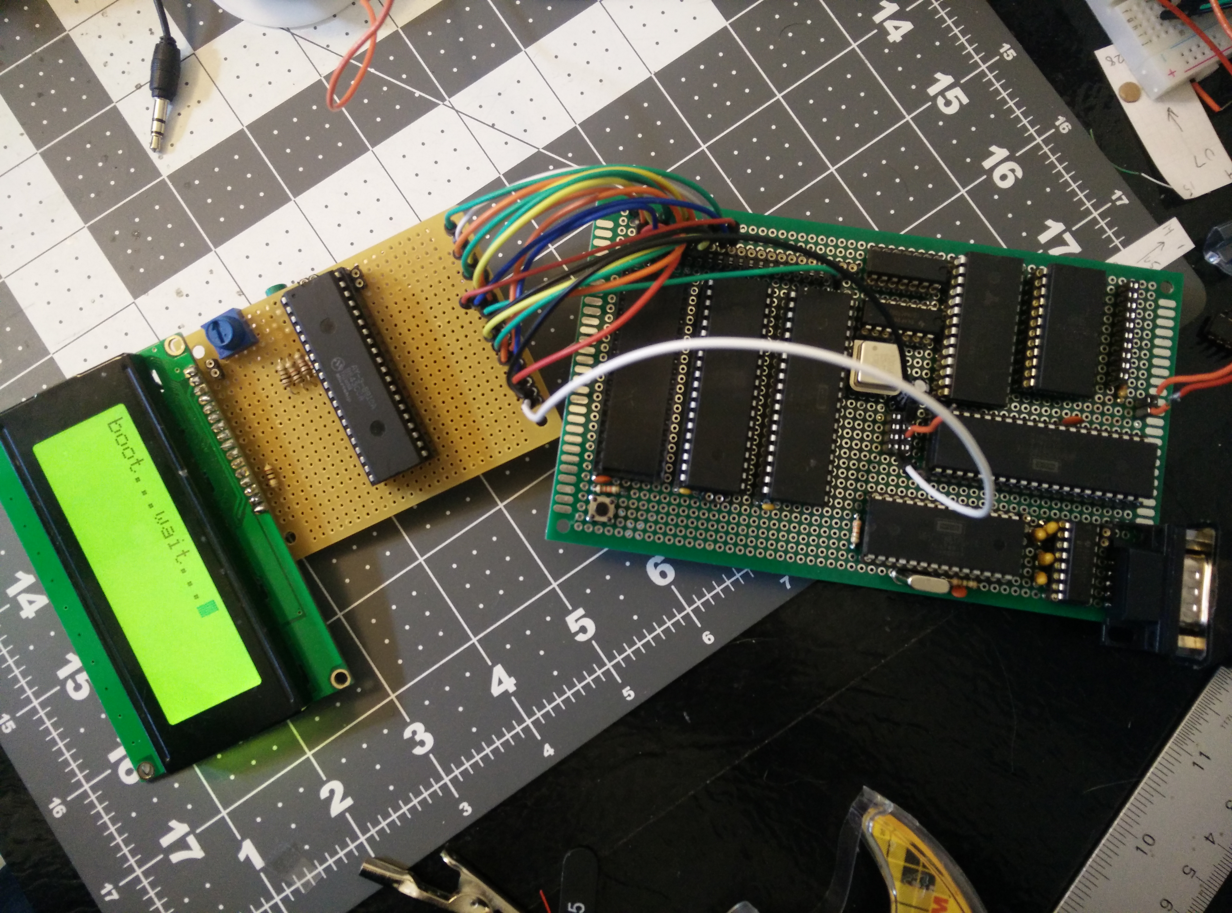 I slowly built the machine on solderless breadboards, starting with CPU, ROM, and LCD display. Then I added RAM and a VIA. Then I added a UART and wrote a ROM that loads assembled machine code from my desktop computer into the f1's RAM over serial line. This made it much faster to experiment with programs than writing and swapping ROMs with every code change.