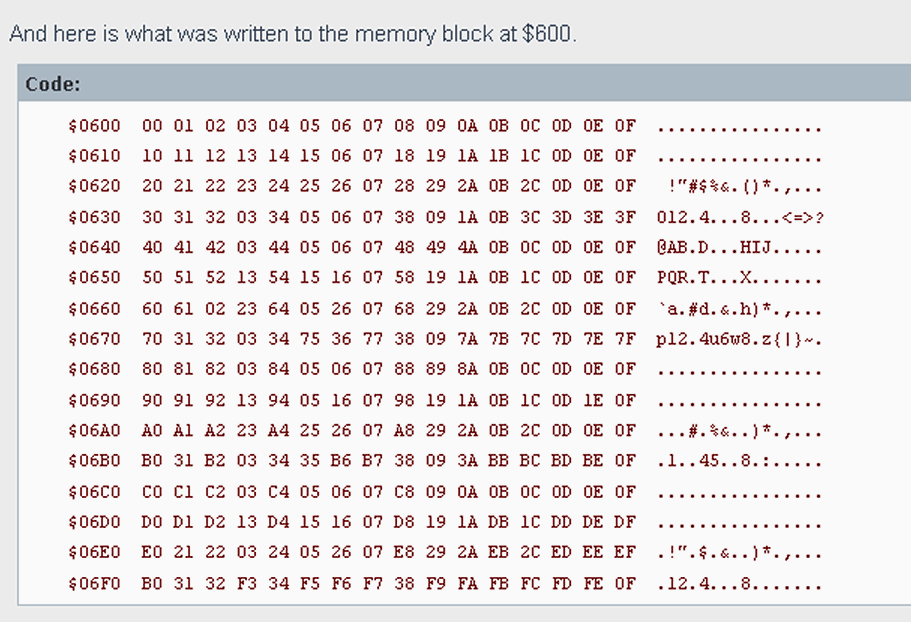 $0600  00 01 02 03 04 05 06 07 08 09 0A 0B 0C 0D 0E 0F  ................