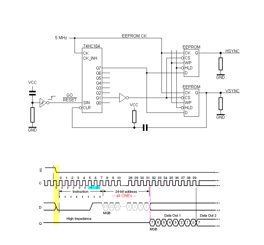 My first pass on the idea (not shown) was a mild case of overkill, although it'd be a good solution for a more complex problem. I'll describe the idea briefly in this paragraph, then move on to a simpler solution. The first pass design used a single SPI EEPROM whose serial output fed a 'HC4015 shift register whose parallel outputs drove a 74_259 octal addressable latch. An extended serial string of zeros would be NOP -- no change. Action results only when the bitstream encounters 5-bit commands in the form of a Start Bit and 4 data bits, with the latter interpreted as 1-bit data and 3-bit address for a write to the '259 output register. So, the command could say things like, "Set the '259 pin that's designated as VSync," or reset it, or set or reset the HSync output instead... Highly flexible, really. The '259 gives you eight outputs to play with, so you'd have quite the little sequencer, and with only a handful of chips!