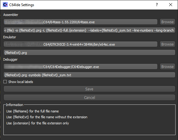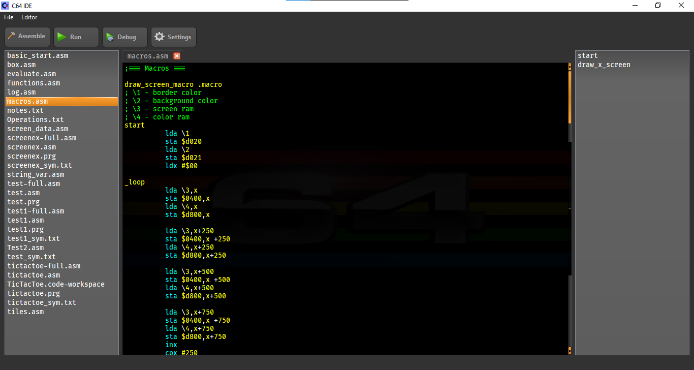 In the main screen, on the left are the workspace files and on the right are the labels in the current file. If you click on a label then the editor scrolls to that label. The editor has syntax highlighting and auto indention.