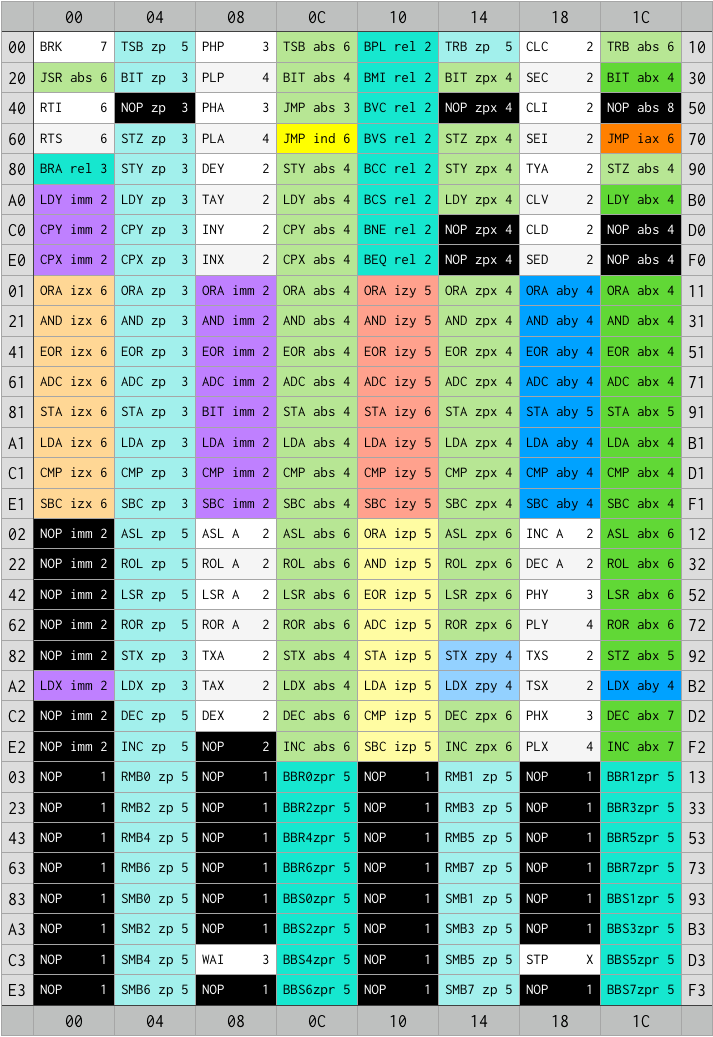 This is for a 65C02 with all the goodies. NMOS is a bit different.