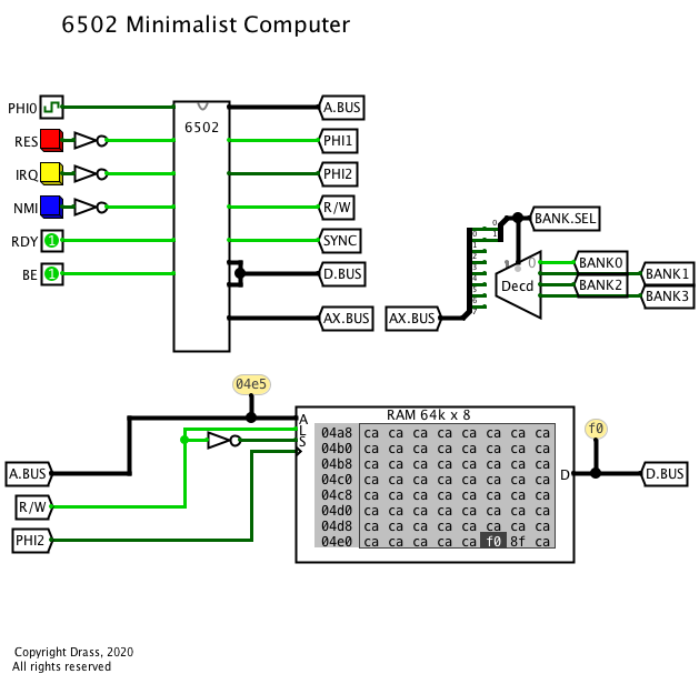 From your simulation I learned that it is a lot more effective (read faster) to just build the model out of native logisim components, than attempting to emulate 74xx ics down to logic gates as I've been doing so far. Btw, I like the D.IN, D.OUT trick to get memory out of the 6502 subcircuit.