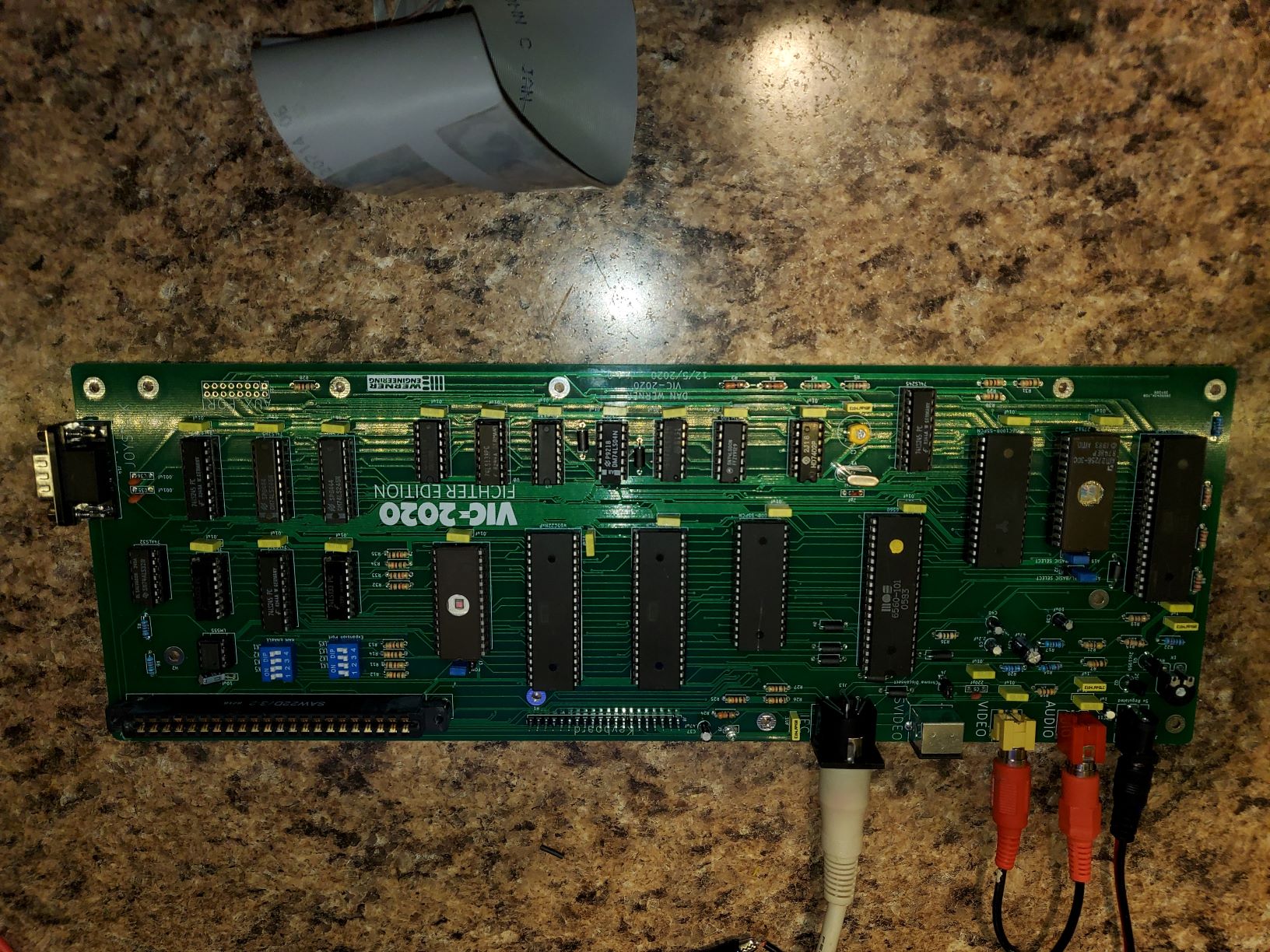 This is the bare board; hard to get a good picture because of the glare. I fit it on an S100-sized card (10" x 5"). I just ordered a bunch of stuff from DigiKey to round-out what I needed. I do so many projects that I have a huge store of random parts. Then I have to dig out a VIC from the attic. I seem to have more C64's than VICs for some reason (I wouldn't mind getting a working but ugly-looking VIC as another spare).