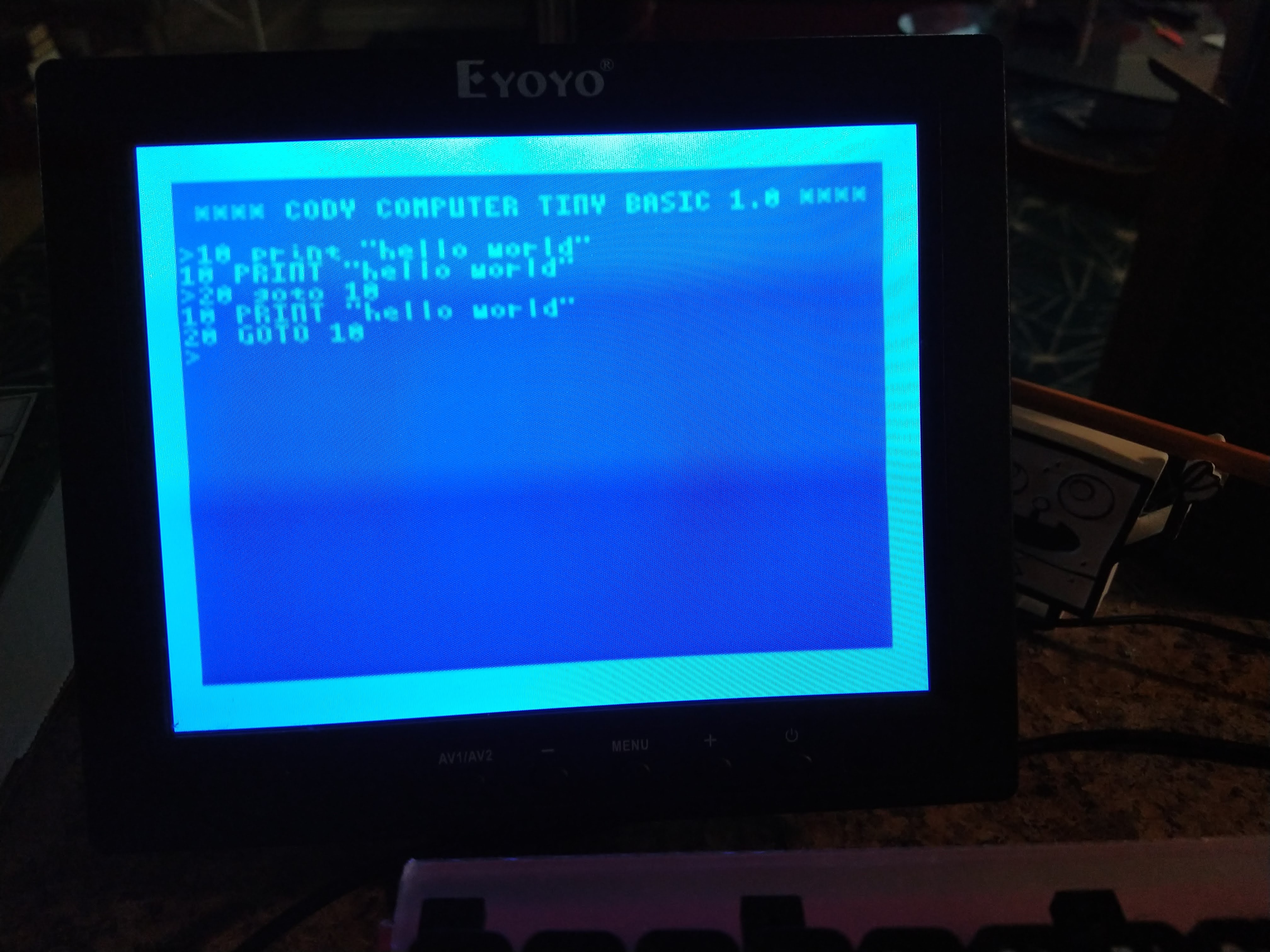 Right now the code that I do have clocks in at under 2 kilobytes when assembled; that includes the "Cody Basic" so far, along with the supporting code I've dragged in for the on-screen terminal, support code for bulk memory operations (heavily borrowed from Bruce Clark's memory routines), and so on. As noted above, no code has been written yet for expression evaluation and so on, and I haven't included my SPI routines yet either. I do not expect to squeeze the remainder in such that I can fit the entirety in 4k, though that may at least be in part to my own ignorance; a better 6502 developer with an eye for space optimization could probably do better.