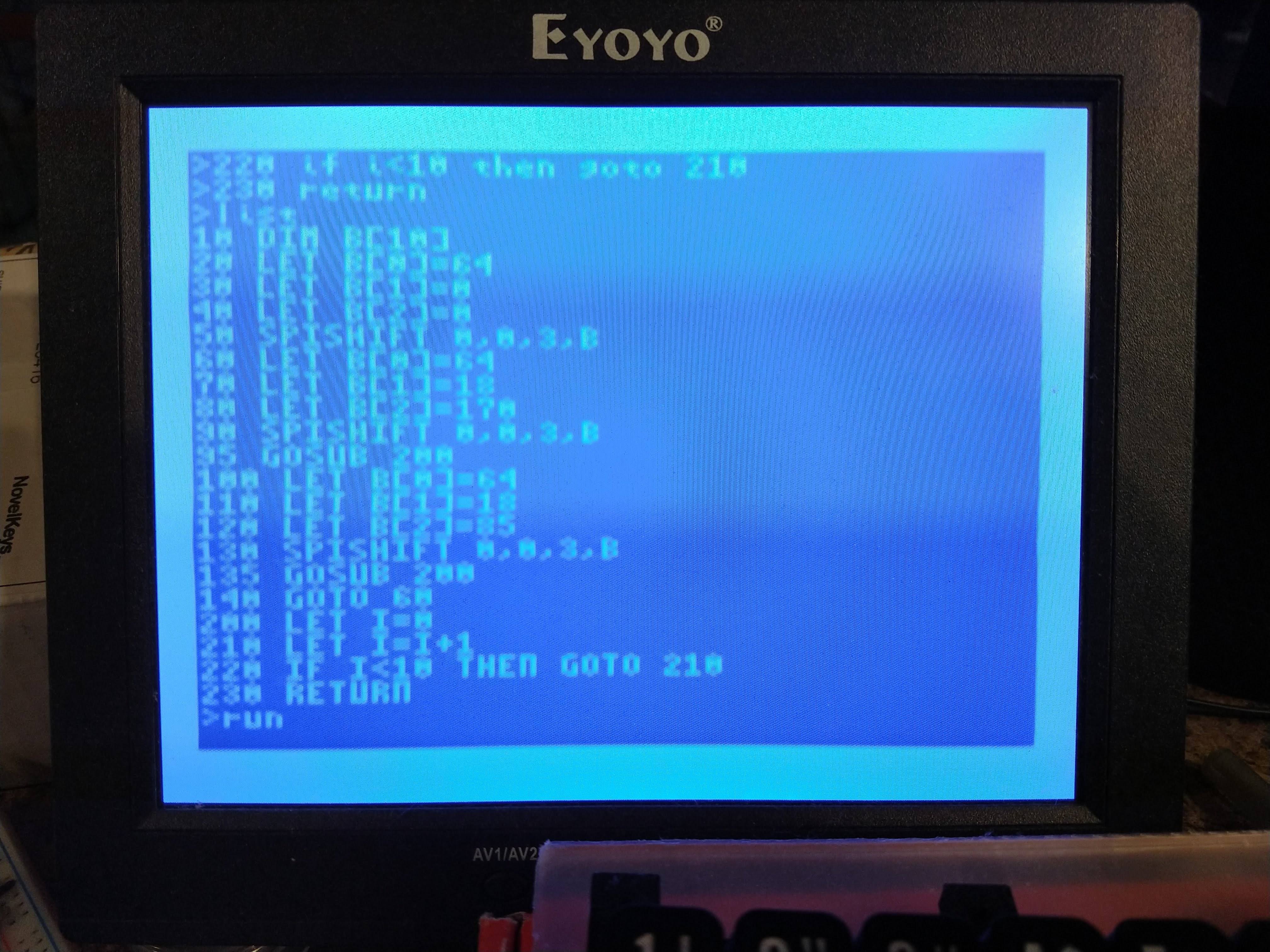 A work-in-progress shot while working on the tokenizer and insert/delete functionality. The first page of BASIC program memory was dumped to the screen for testing.