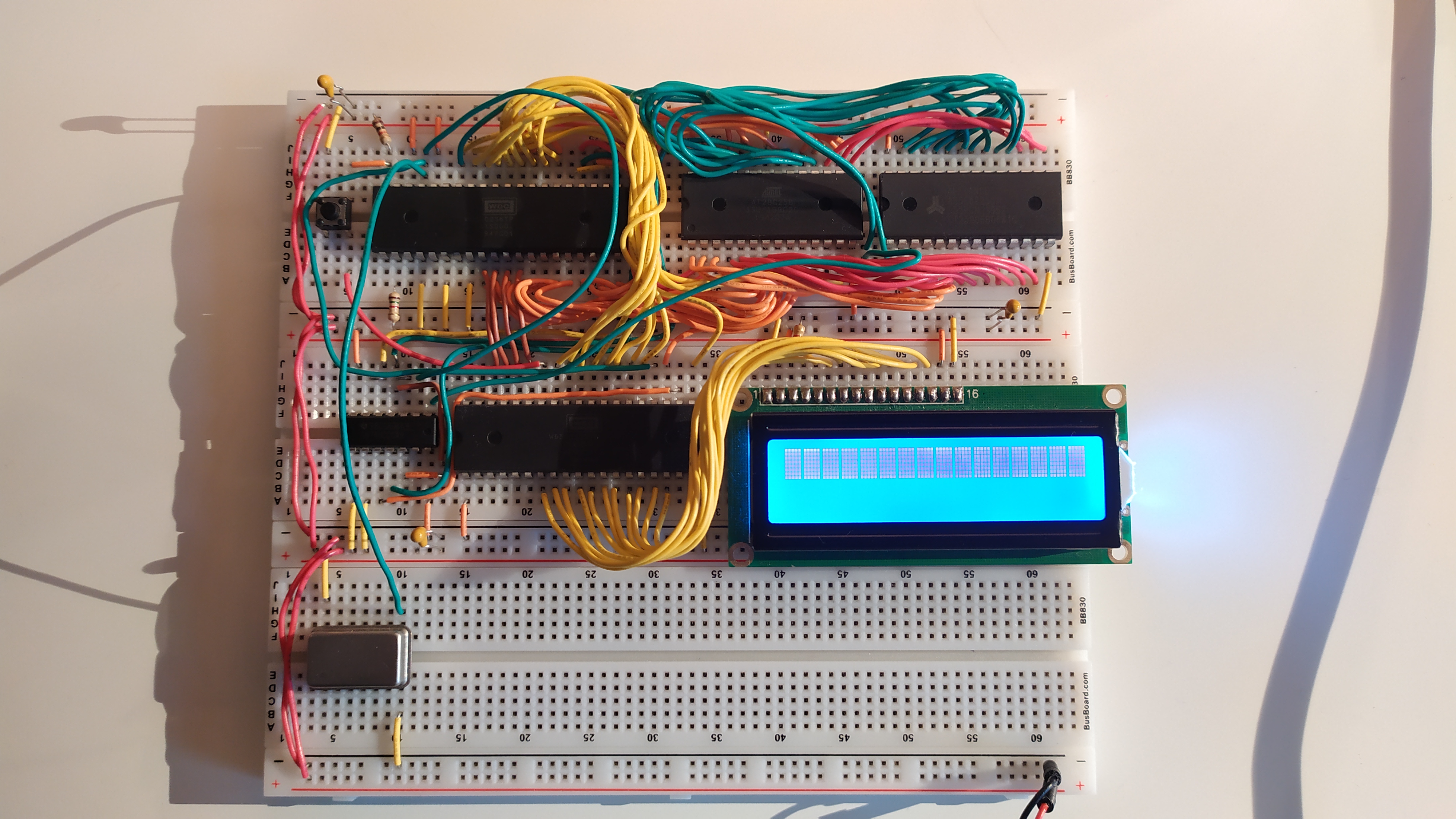 What are the other chips you have in the circuit? If any of them require 5v, you might want to check the voltage at the power pin of each chip and the LCD individually. Depending on the breadboard and wires you're using, it could be dropping significant voltage, though it looks like you're using the breadboards that Ben Eater recommends