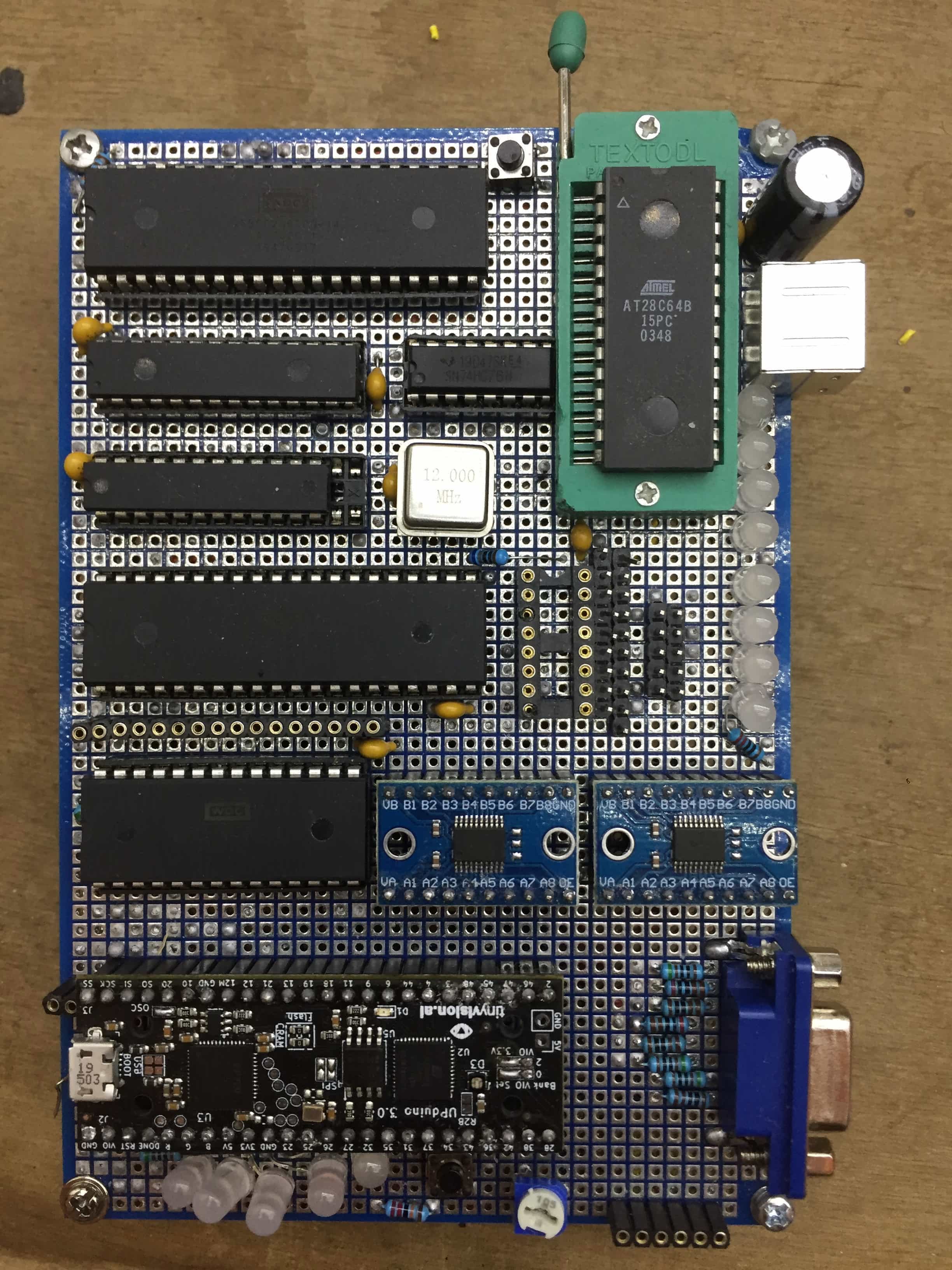 I also used a 74245 buffer of some sort since my fpga runs at 3.3V and the 6502 at around 4V-5V. You may not need this, but it is probably a good idea to drive enough current into the long PCB lines of the old NMOS board. Also put on some capacitors to help the buffer to drive them.