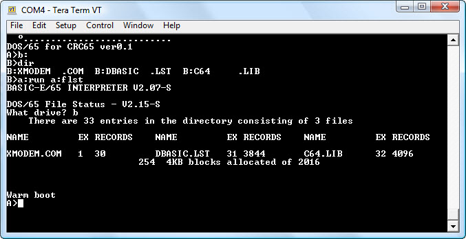Attached is CF image of DOS/65 rev0.2. Unzip and copy to a new CF disk (32MB or bigger) using disk imaging tool such as Win32DiskImager. It should autoboot into DOS65 and you should see the same files as the screen capture below. Works are in progress for the 3 programs below: