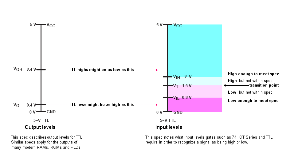 • on the input side, you'll notice that the specs call for highs that are above the actual transition point and lows that are below that transition point. So, the specs call for some extra margin. But cutting corners with that margin won't necessarily result in failure.