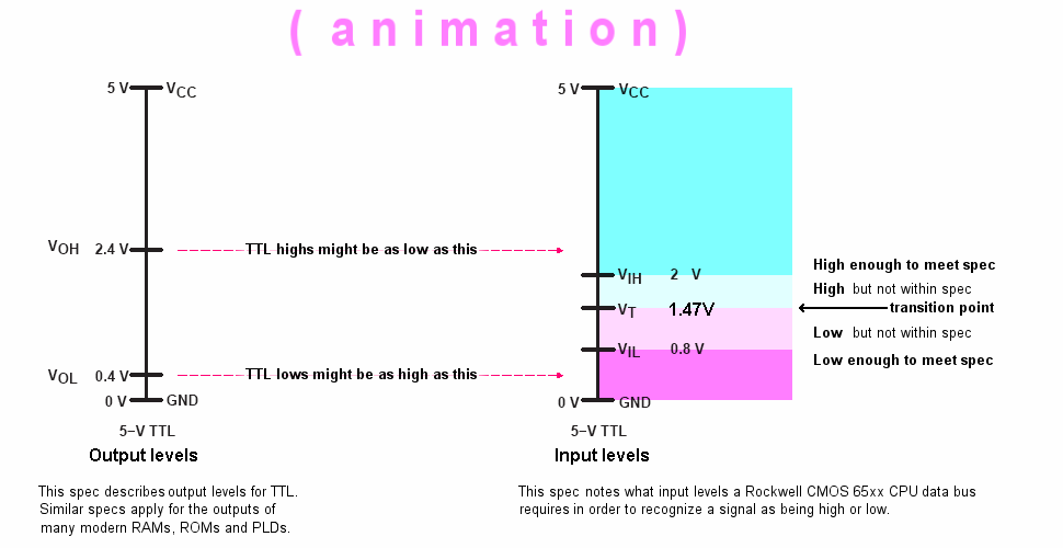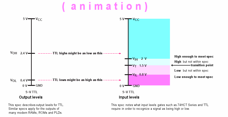 • on the input side, you'll notice that the specs call for highs that are above the actual transition point and lows that are below that transition point. So, the specs call for some extra margin. But cutting corners with that margin won't necessarily result in failure.