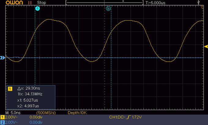 33.78MHz now! But I think it's he driving 74HC00 that is causing the limit here. The occasional droop in the clock wave at that speed.