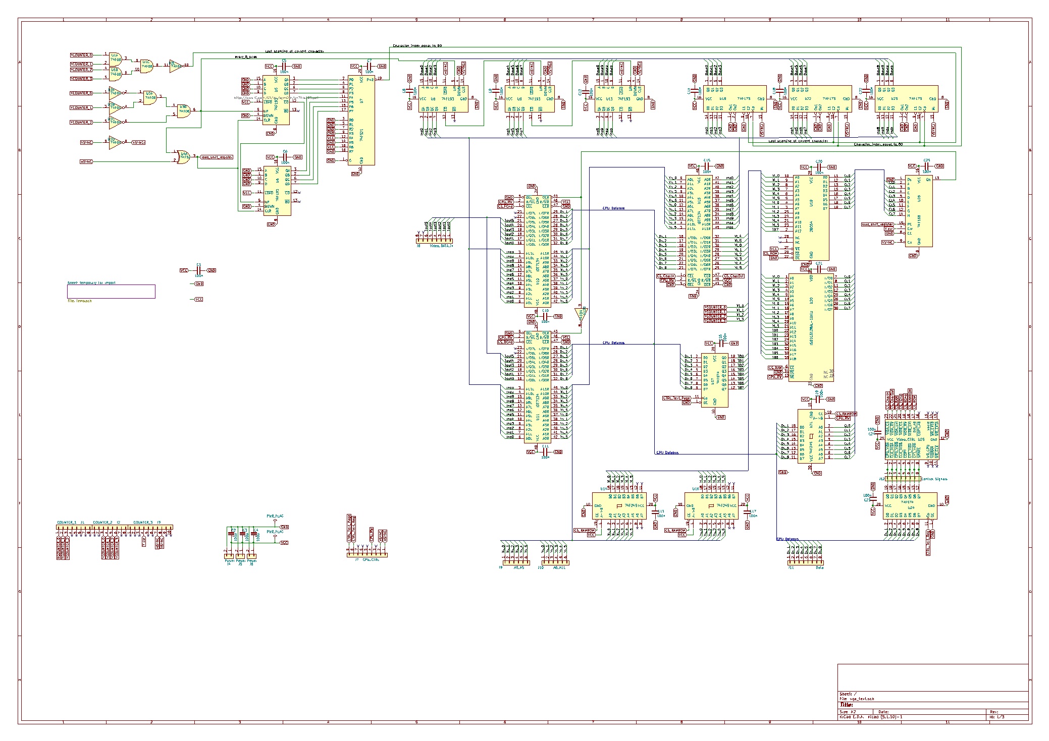 Here is the first iteration. It uses 3 dual pot rams now - one for the character value, one for foreground and one for background. So in the end you should be able to define foreground and background color of each character. It also sprouts basic ROM and 512 MB character RAM (simply because I have those chips lying around)