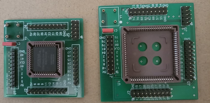 Video development was a combination of breadboard / plugin prototype perf board and a CPLD module. I'm using the Altera MAX7000 discussed in posts on 6502.org. The MAX7000 is obsolete but the Microchip/Atmel part is still available. I highly recommend these parts. Don't struggle with masses of 74 series logic on breadboards unless you have lots of time and like the pain of reworking things when they don't work. It's much easier to redraw, compile and test (or simulate) schematics. I bought the MAX7000 from suppliers on AliExpress. Here are the CPLD modules I made.