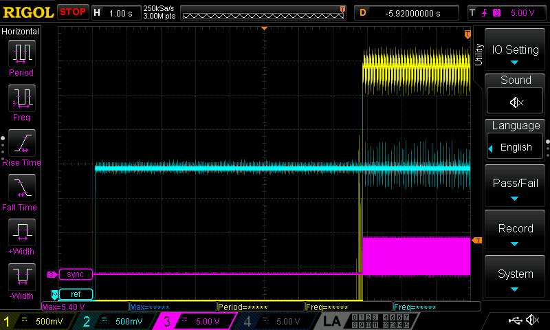 I'm attaching some photos from an oscope trace of turning the board on. Due to the layout, it's not very easy for me to probe the pins directly on the DS1813. So, acknowledging that the SYNC will lag a few cycles behind leaving reset. On the trace, blue is the 5v supply, pink is SYNC, and yellow is RESET. This is all from the same power on, I've just zoomed a bit to show interesting things on the main trace.