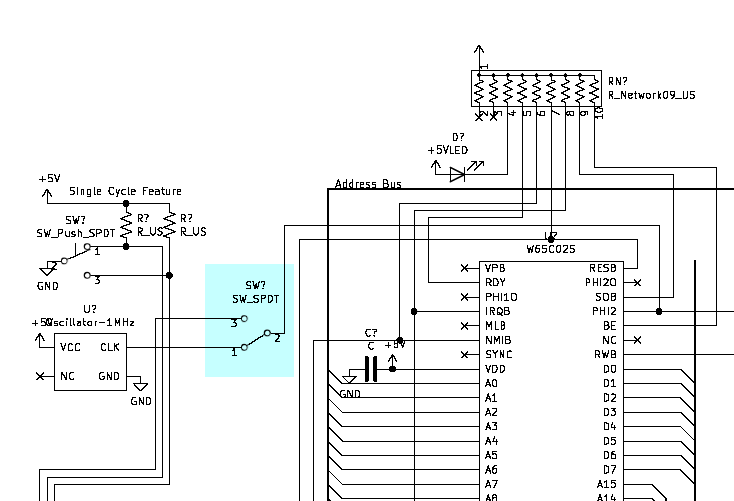 If you do include the single step, you may wanna also include some LED's on the buses, because it's a whole lot easier to just look at 8 LED's and say, "Oh - that's hex 34," or whatever, rather than doing 8 successive pokes with the logic probe. Ideally you'd have 8 LED's for the data bus and 16 for the address, but last time I did this I omitted the LED's for A8-A15. Speaking of LED's, you'd wanna include R/W and probably SYNC.